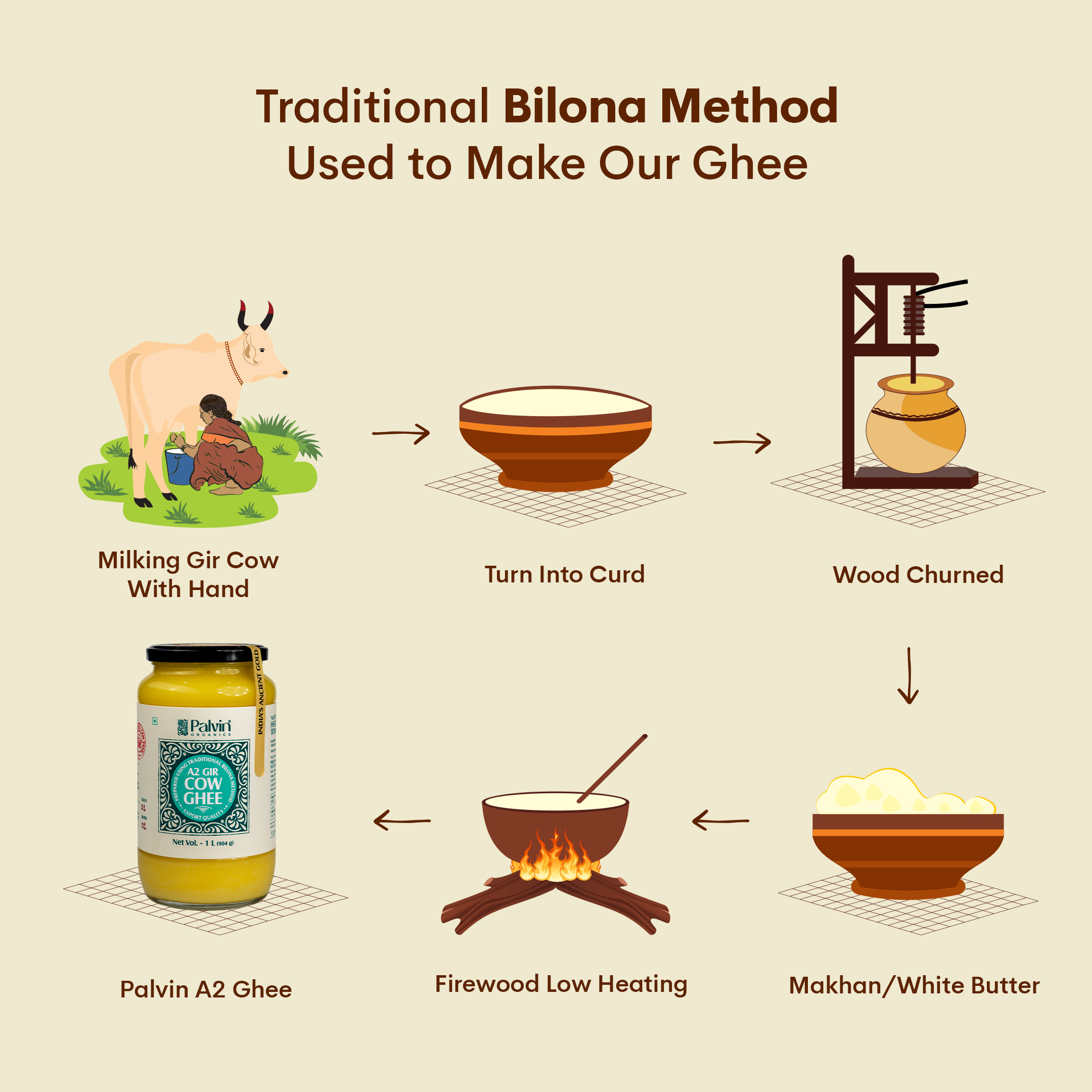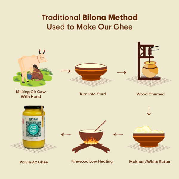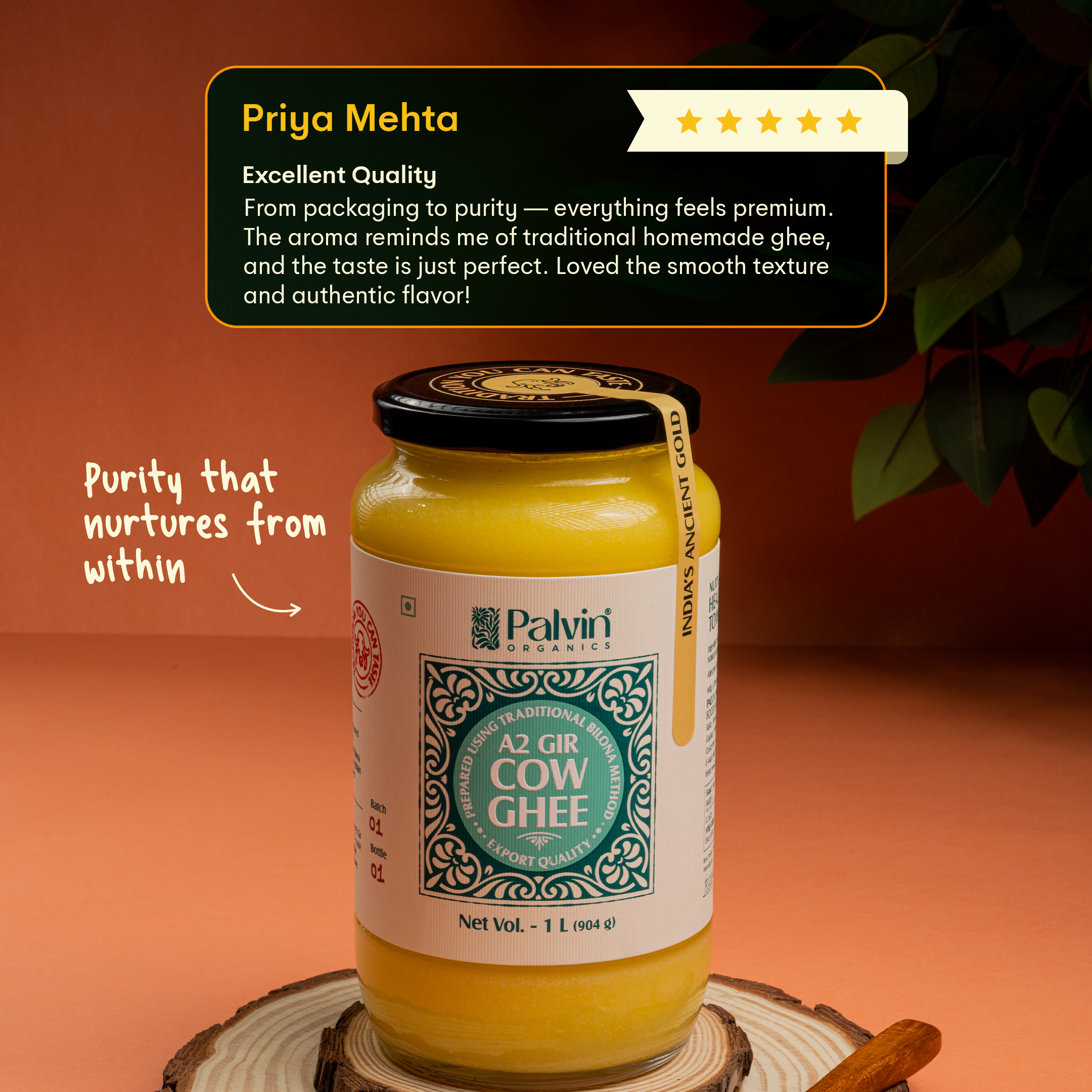 Unlike ordinary ghee, Palvin Ghee retains the A2 beta-casein protein, making it easy to digest, lactose-friendly, and deeply nourishing for all age groups. It’s free from preservatives, chemicals, and adulteration — just 100% pure, farm-fresh goodness straight from Gir.