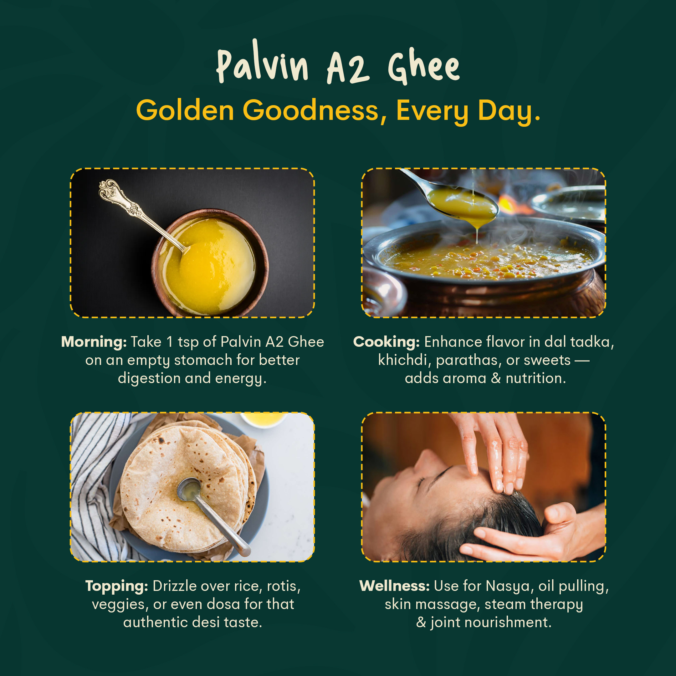 Whether you drizzle it over rotis, use it for tadka, or offer it in puja, Palvin A2 Ghee adds a divine taste and wholesome touch to every meal.