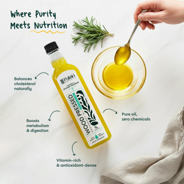 Experience the purity of nature with Palvin Organics Wood Pressed Oil, extracted through the traditional lakdi ghani method. Each drop is cold-pressed at low temperatures to preserve its natural aroma, golden color, and wholesome nutrients.